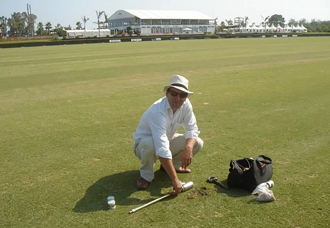 Dr Tim Lodge inspecting the Bermuda grass of the Sotogrande polo grounds, southern Spain.