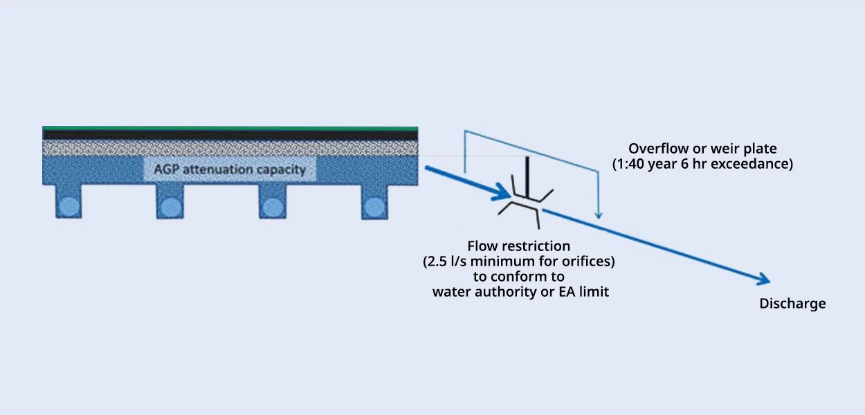 Diagram showing flow restriction and discharge rates from artificial grass pitch drainage system