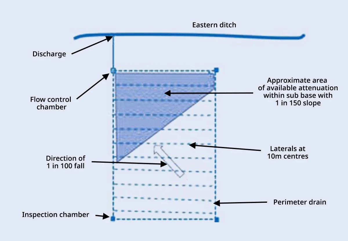 Illustration showing how slope of artificial grass pitch affects drainage attenuation capacity